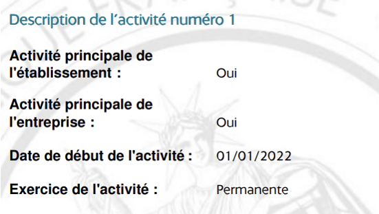 Consultez votre synthèse d'immatriculation de l'INPI. La date de début d'activité est indiquée en section ''Description de l'activité numéro X'' (cf capture d'écran ci-dessous)