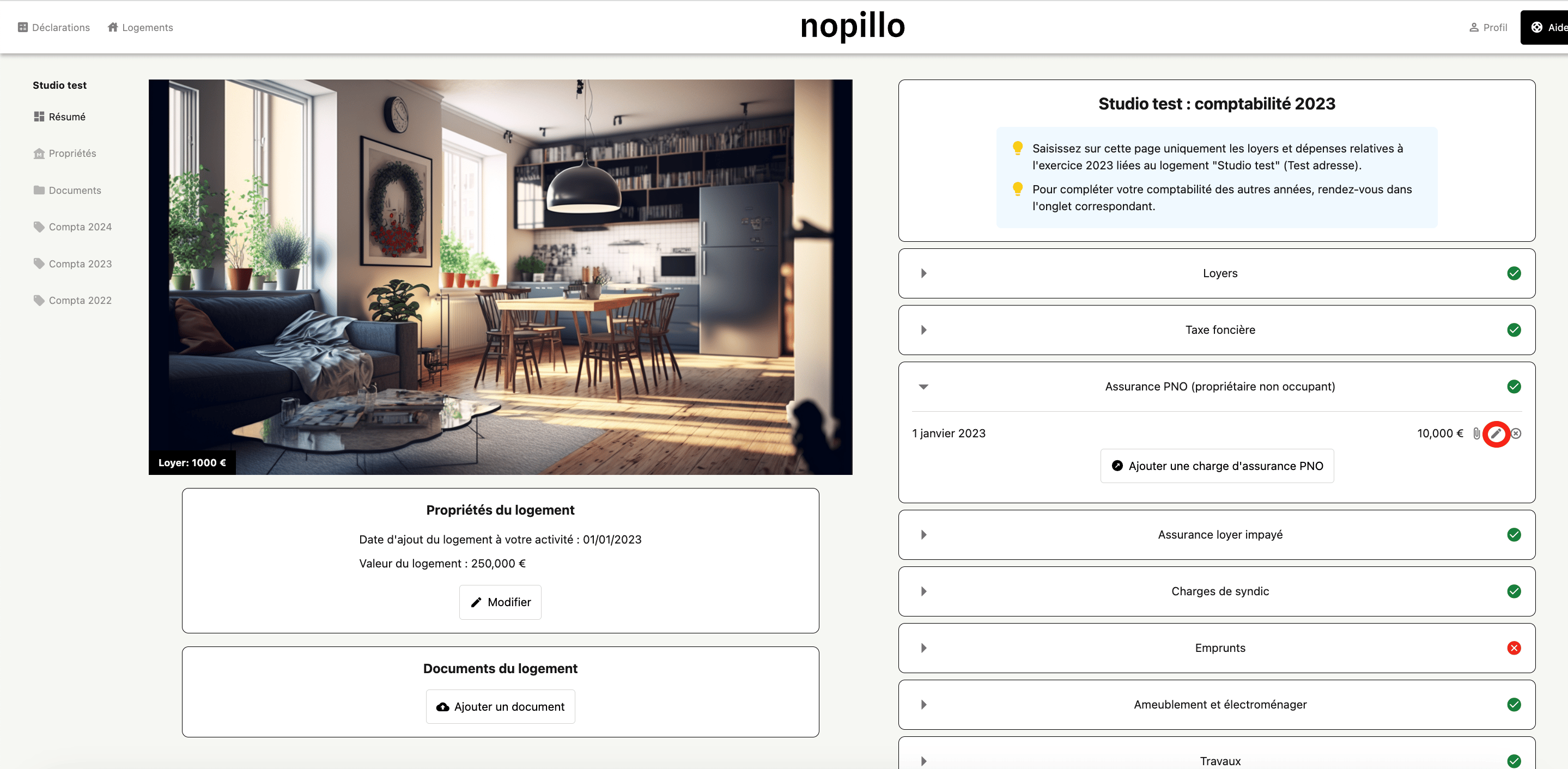 - Retournez sur votre espace Nopillo -> Catégorie ''Assurance PNO'' -> Cliquez sur le petit stylo entouré en rouge :
