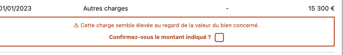 Ce message se déclenche automatiquement lorsque le montant des autres charges est supérieur ou égal à 5% de la valeur de votre bien.