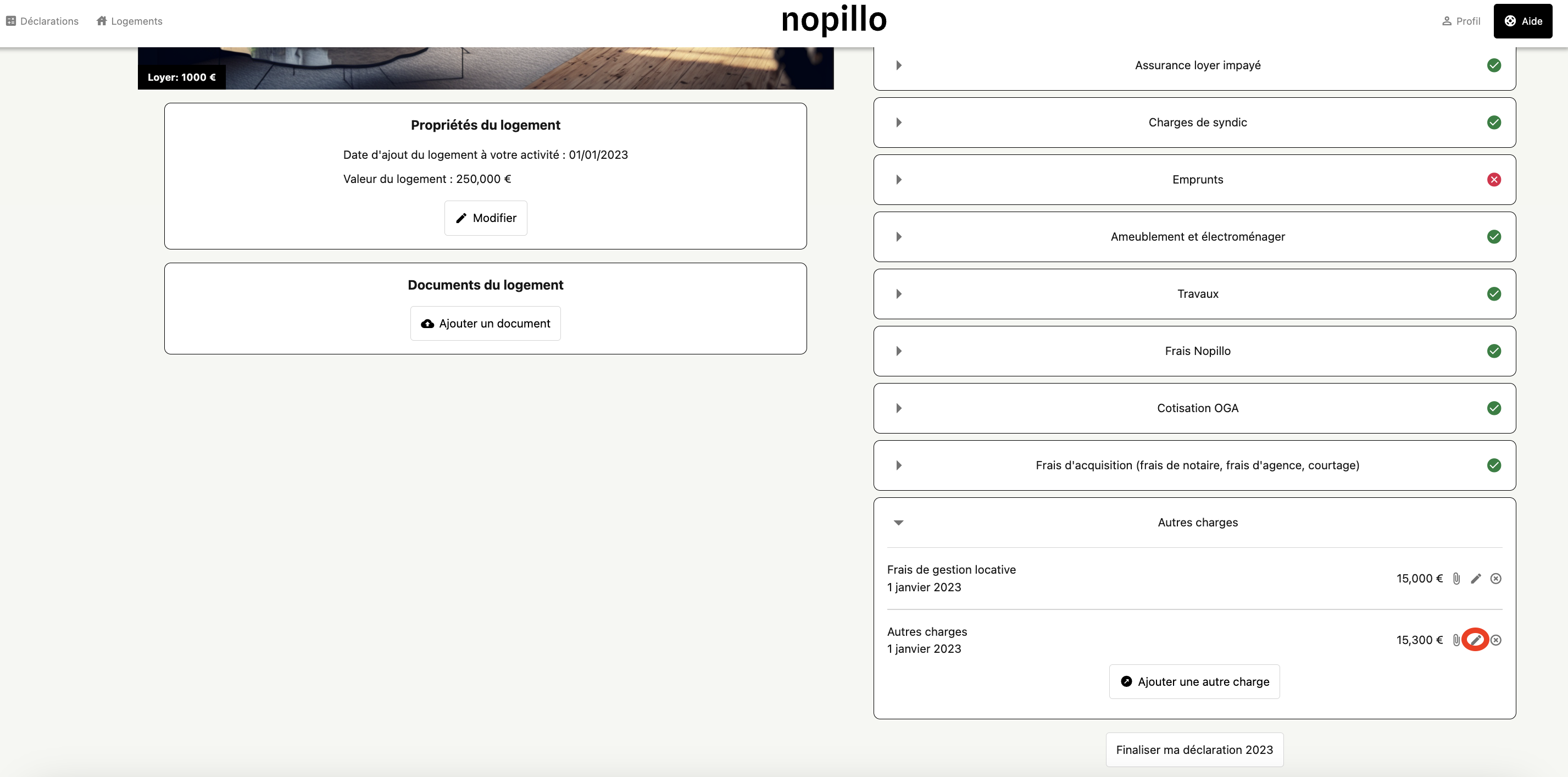 - Retournez sur votre espace Nopillo -> Catégorie ''Autres charges'' -> ''autres charges'' -> Cliquez sur le petit stylo entouré en rouge :