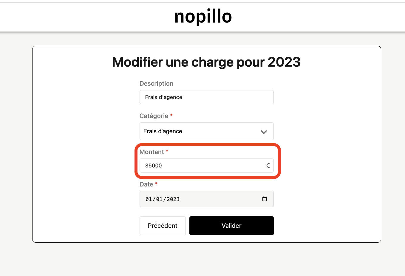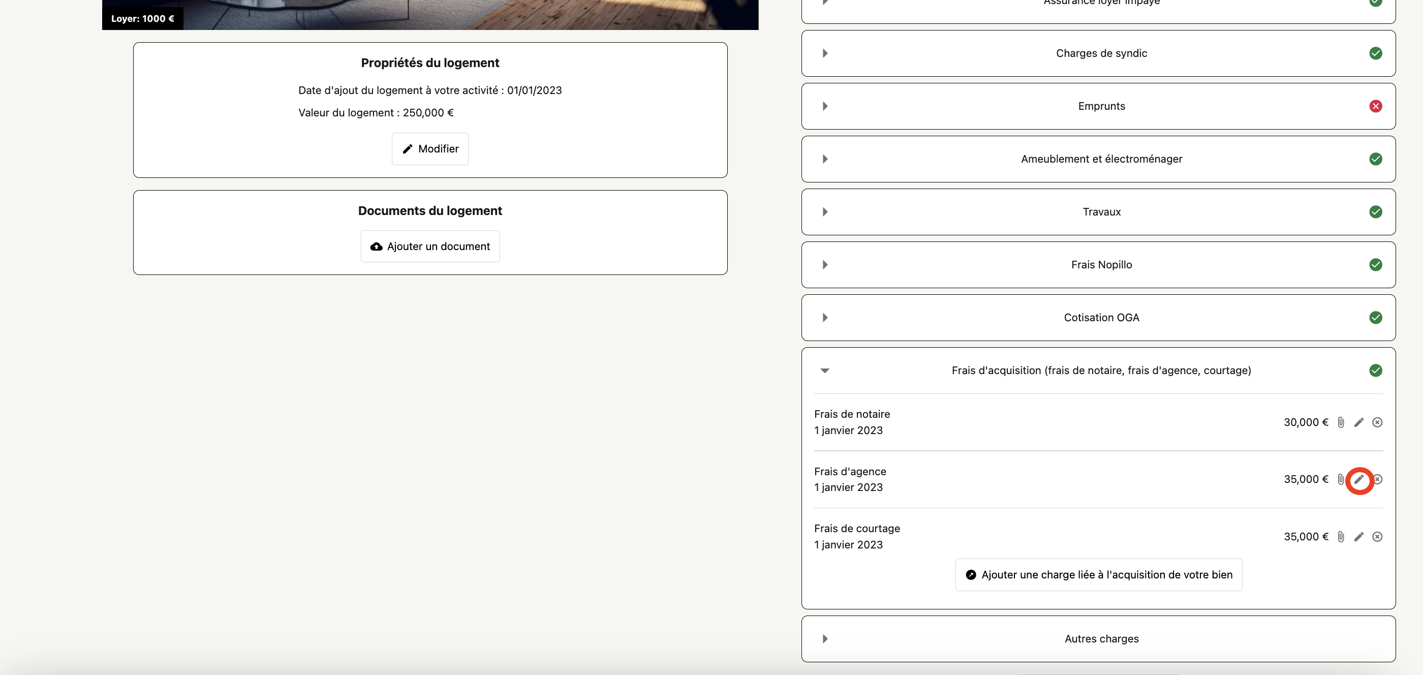 • Retournez sur votre espace Nopillo -> Catégorie ''Frais d'acquisition'' -> ''Frais d'agence'' Cliquez sur le petit stylo entouré en rouge :