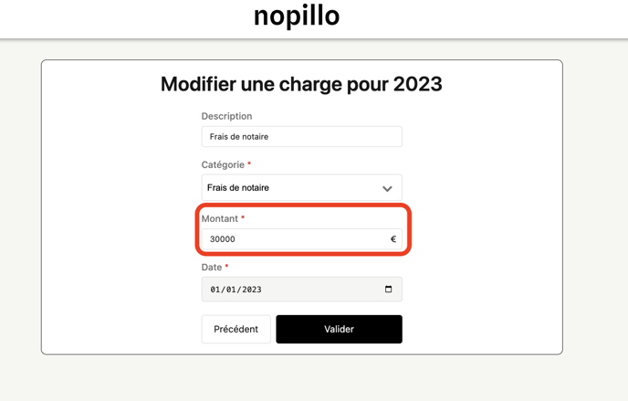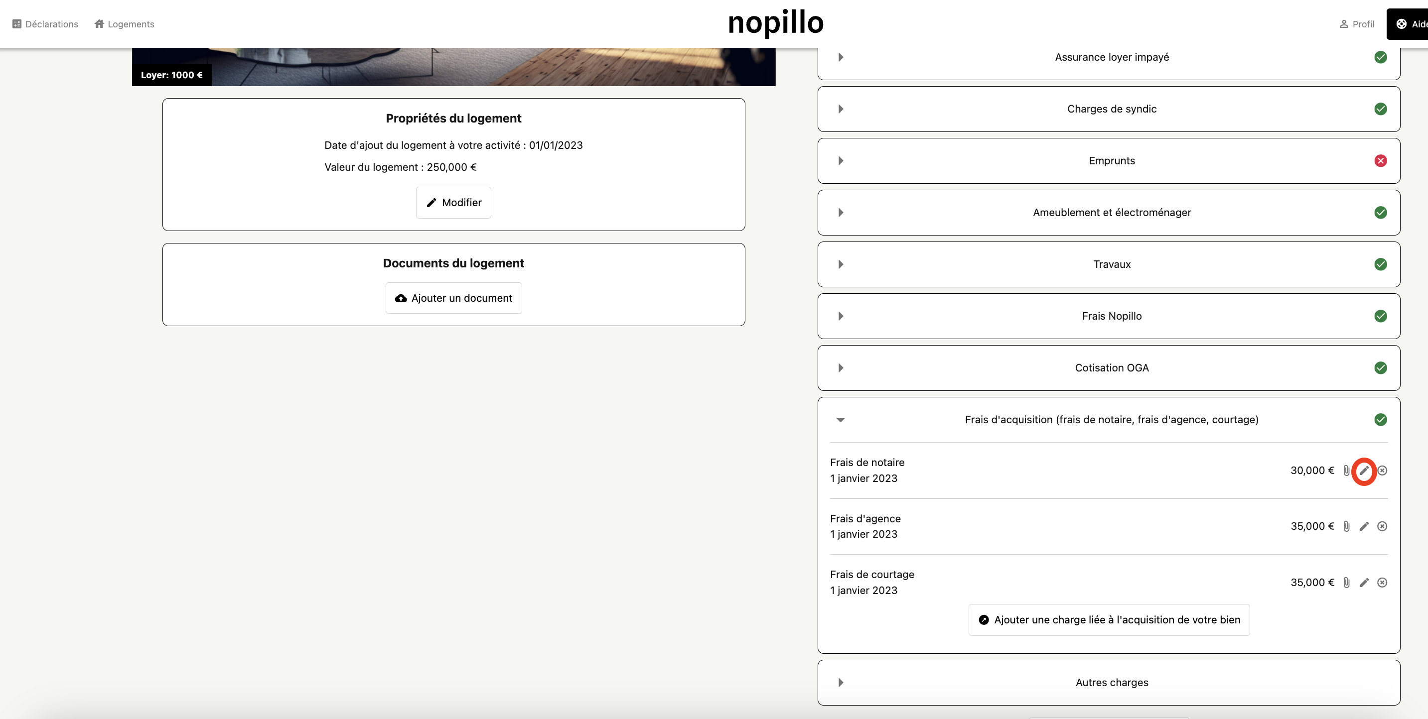 • Retournez sur votre espace Nopillo -> Catégorie ''Frais d'acquisition'' -> ''Frais de notaire'' Cliquez sur le petit stylo entouré en rouge :