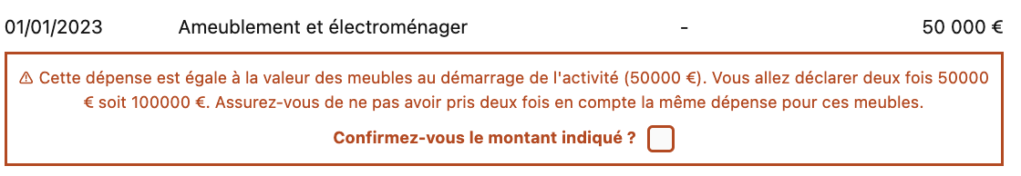 Le message 1 se déclenche quand : Vous avez renseigné une valeur de mobilier deux fois, vous pouvez vous référer à cet article d'aide pour savoir où déclarer la valeur du mobilier au démarrage de l'activité (avant votre DDA) et le mobilier acheté après votre début d'activité.