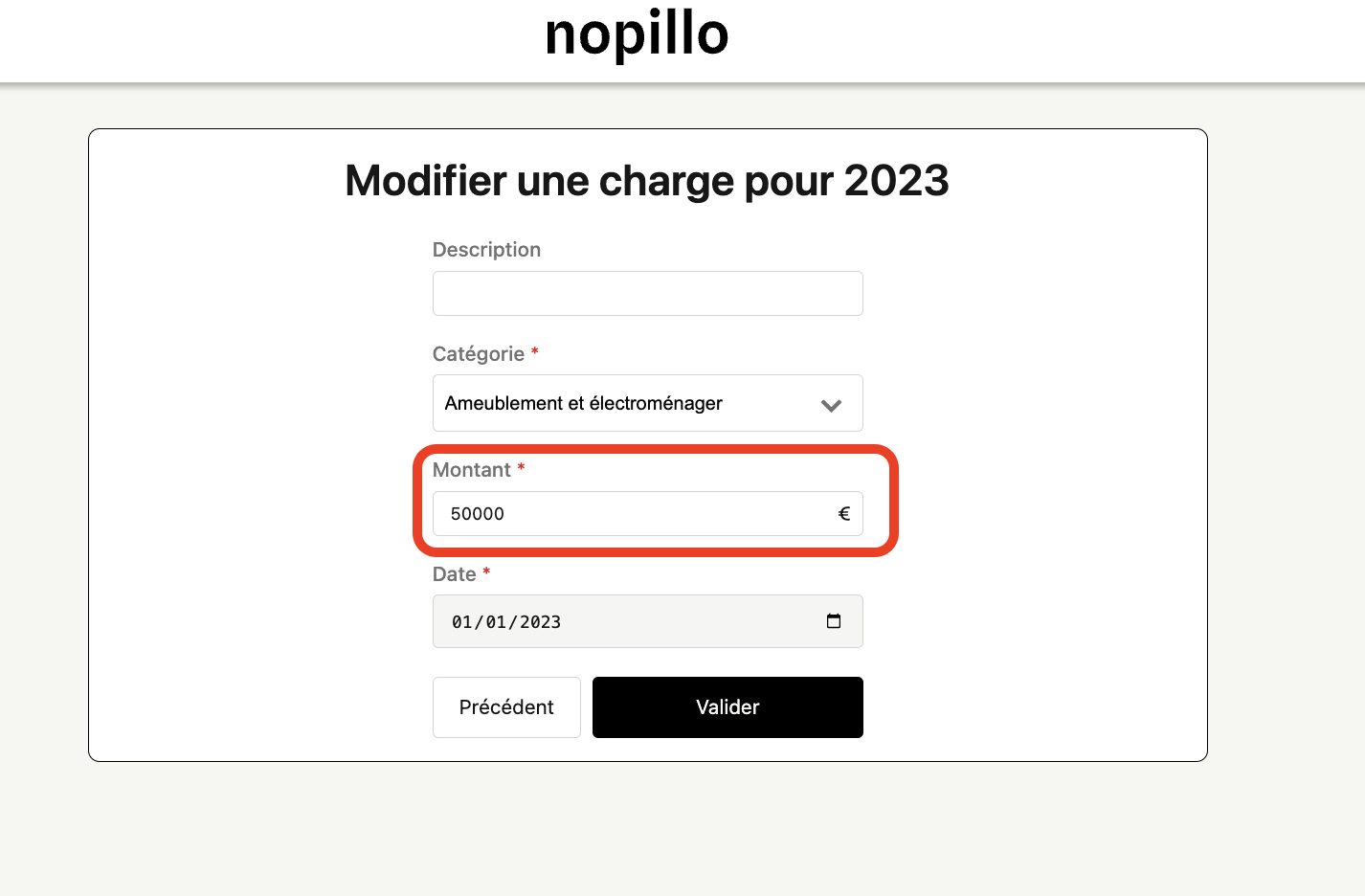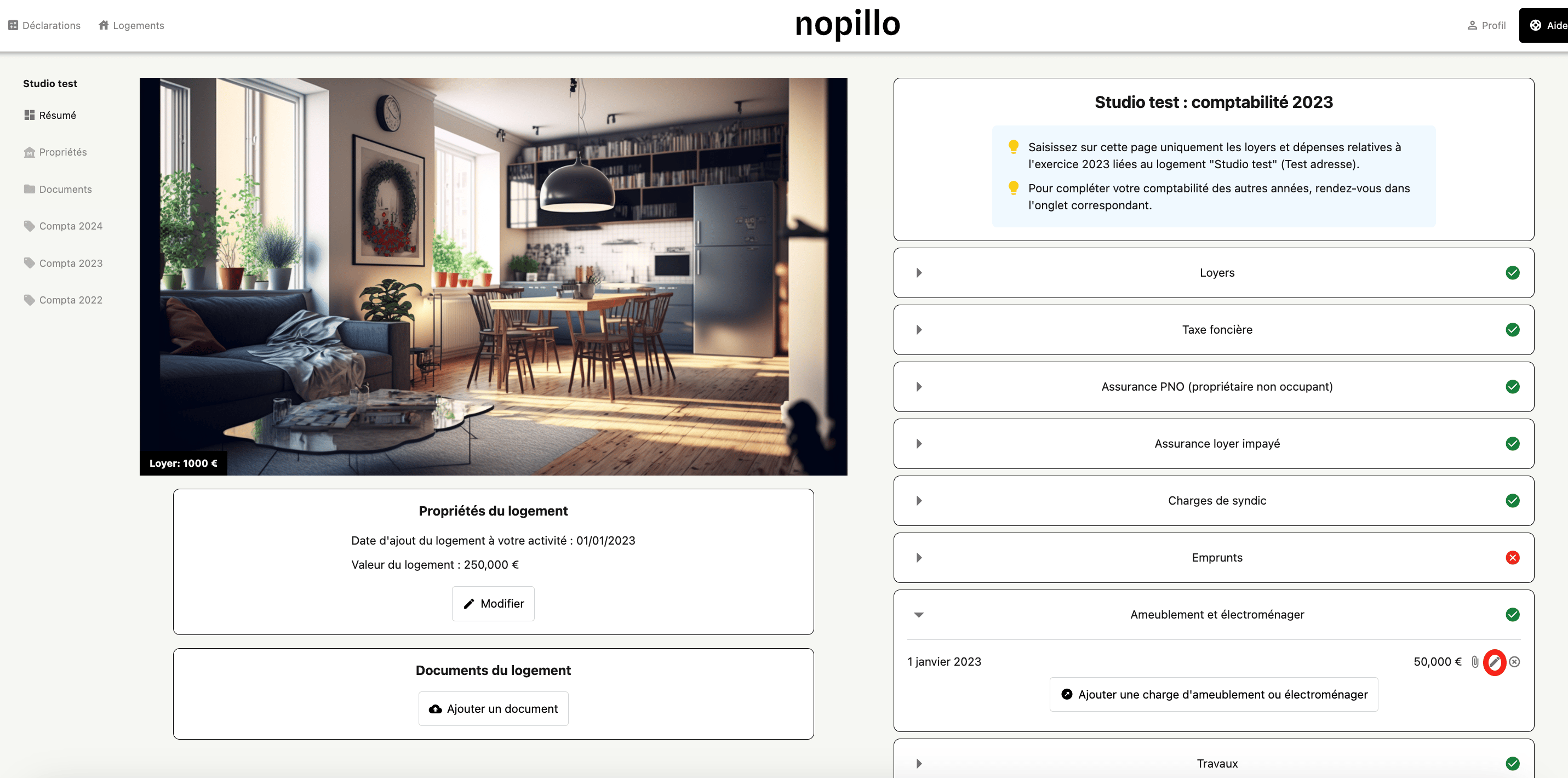 - Retournez sur votre espace Nopillo -> Catégorie ''Ameublement et électroménager'' -> ''Frais de notaire'' Cliquez sur le petit stylo entouré en rouge :