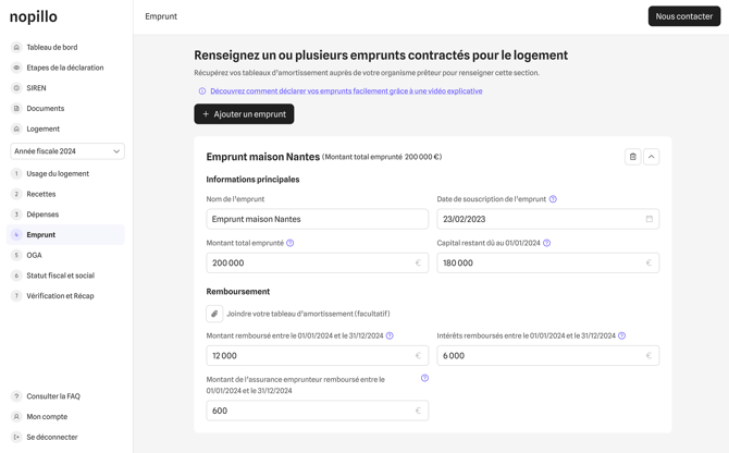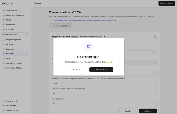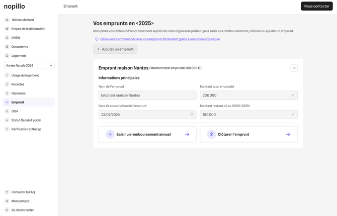 Vous pouvez modifier ou supprimer un emprunt Ă tout moment, tant que votre liasse fiscale nâa pas encore Ă©tĂ© soumise Ă Nopillo. Une fois la dĂ©claration envoyĂ©e, les donnĂ©es ne seront plus modifiables.