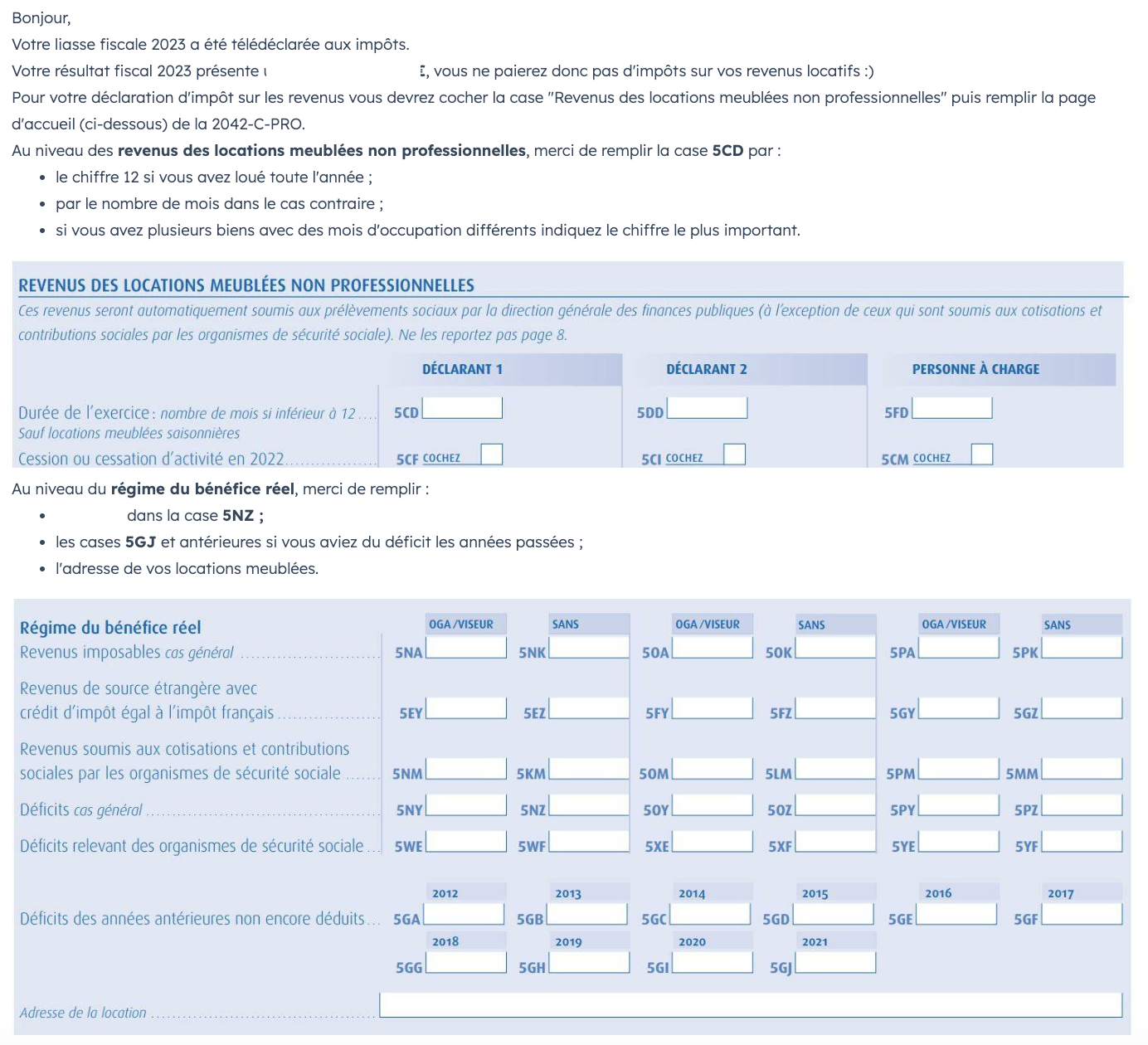 Etape 3 : Vous recevez un mail automatique prenant cette forme (cf capture d'écran ci-dessous) qui vous explique quel(s) montant(s) reporter dans votre déclaration d'impôts personnelle.